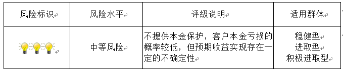 本期产品内部风险评级级别为3盏警示灯,风险程度属于中等风险。最不利情况下,资产组合无法回收任何本金和净收益,客户将损失全部本金。产品适合于稳健型、进取型及激进型客户。客户不得使用贷款、发行债券等筹集的非自有资金投资本产品。